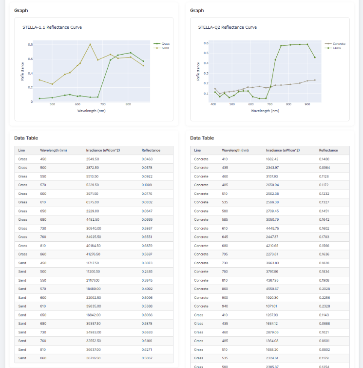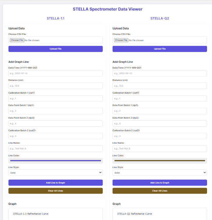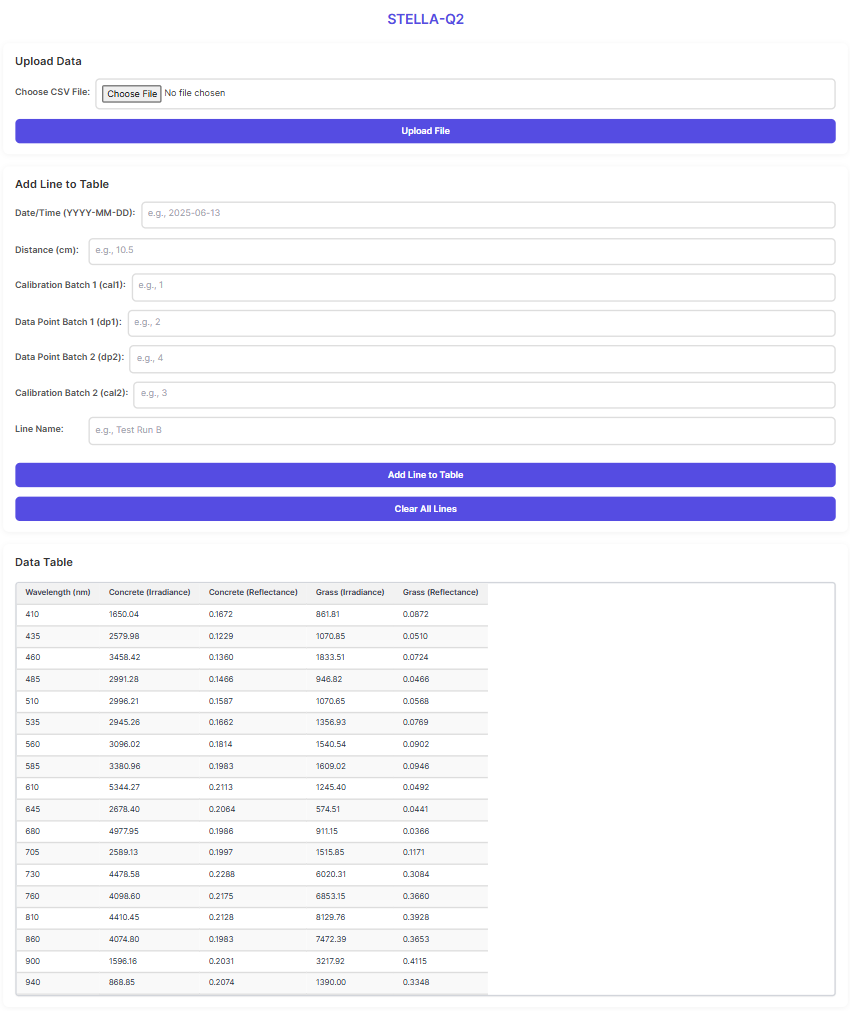 Beyond hardware work, Inna developed web-based tools that would be used by educators and students worldwide. Her first website, built using Python Flask and HTML, supported both STELLA-1.1 and STELLA-Q2 systems. The platform enabled users to upload CSV files from the device’s SD card, input measurement parameters, and generate spectral graphs with accompanying data tables.